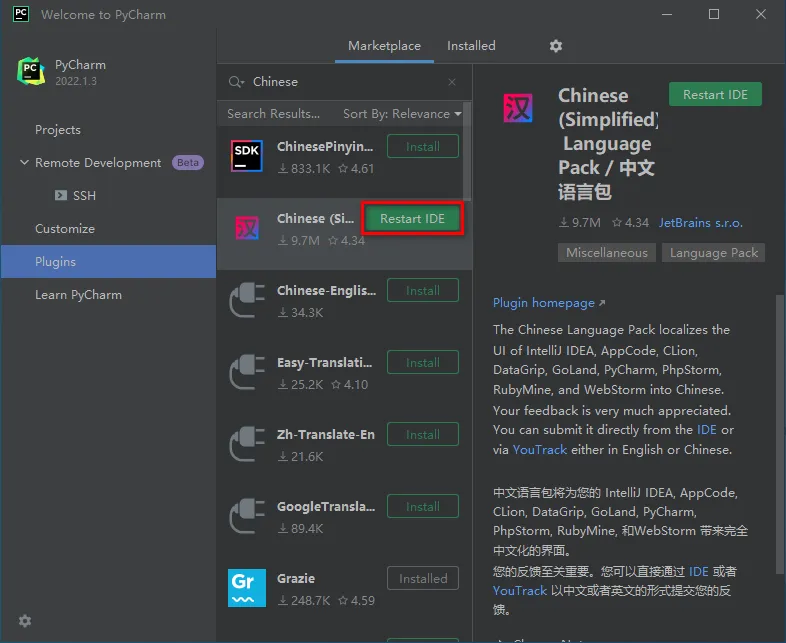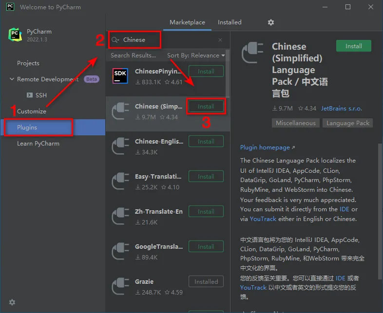 17.点击Plugins,输入:Chinese,找到Chinese(Simplified),点击“Install”