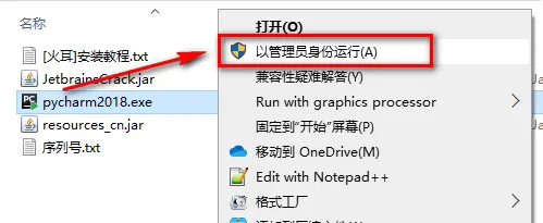 2.选中pycharm2018,鼠标右击选择“以管理员身份运行”