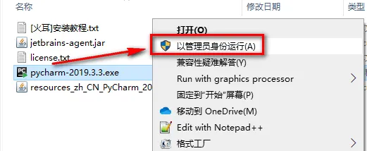 2.选中pycharm-2019.3.3,鼠标右击选择“以管理员身份运行”