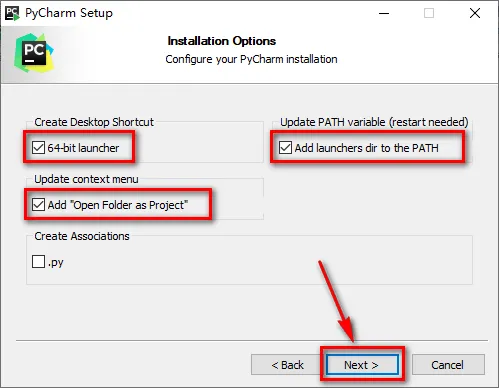 5.勾选64-bit launcher、Add launchers dir to the PATH和Add "Open Folder as Project",点击"Next"