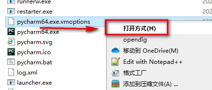 12.在该目录下找到pycharm64.exe.vmoptions,鼠标右键点击“打开方式”