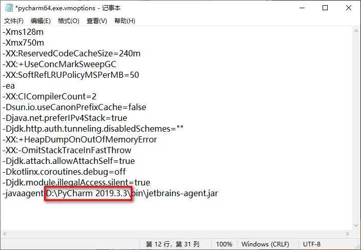 14.在文档的尾部加上:-javaagent:D:\PyCharm 2019.3.3\bin\jetbrains-agent.jar。其中【D:\PyCharm 2019.3.3】是软件的安装目录(第4步设置的路径),然后按下快捷键Ctrl+S保存该文档