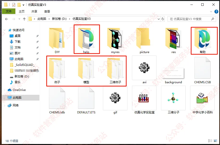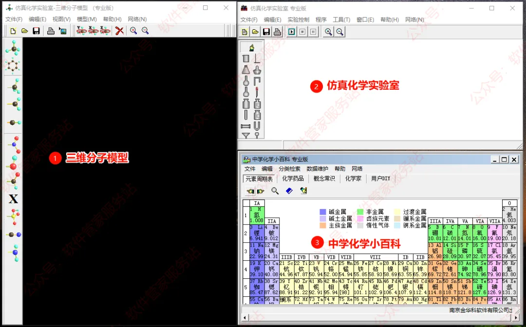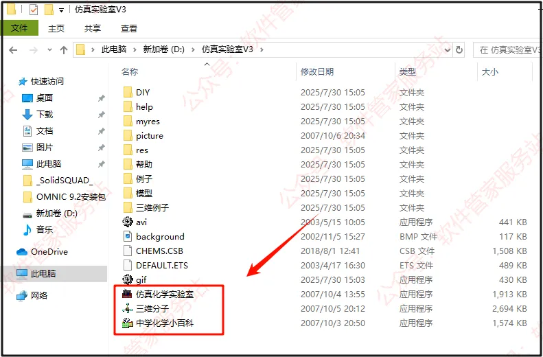 第三步:打开解压后的文件夹,此程序为绿色版,不需要安装。提供了三款软件,分别是【仿真化学实验室】【三维分子】【中学化学小百科】。