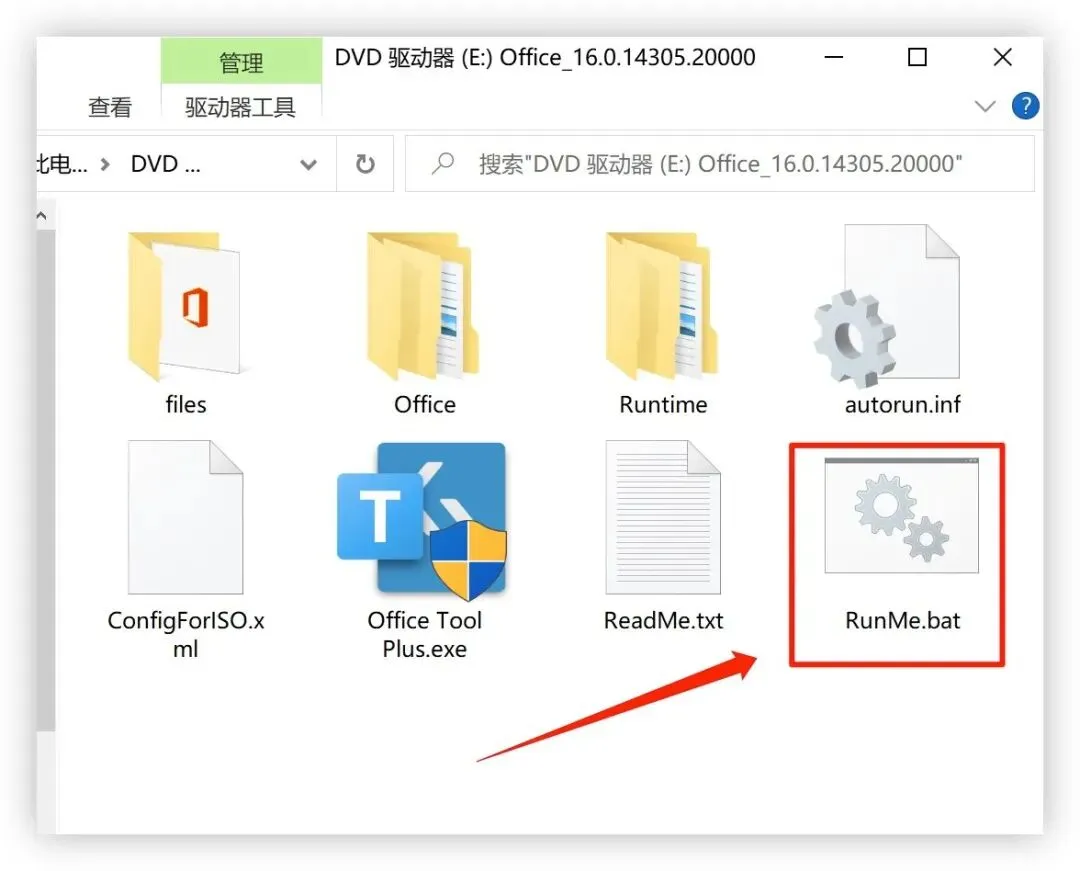 2、从文末提供的网盘链接,下载 Office 安装镜像(仅 64 位),下载完成之后,双击打开 ISO 镜像,双击里面的「RunMe.bat」文件,请勿直接运行 EXE 文件,否则无法完成后续安装。