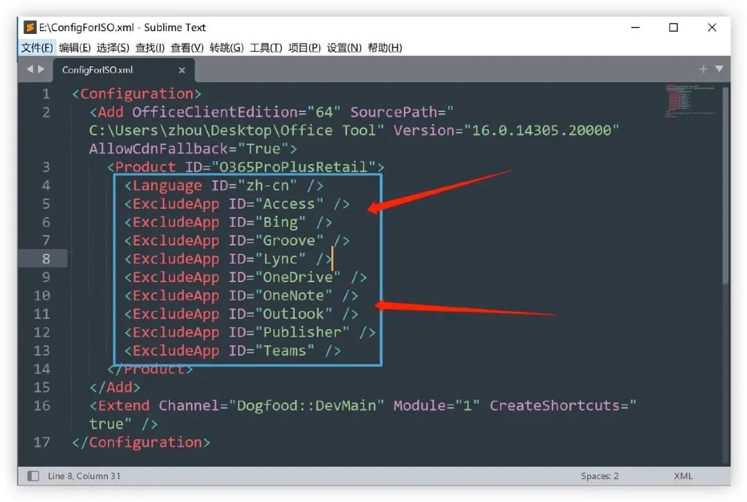 注意:默认情况下,只会安装 Word、Excel、PowerPoint 三大组件,如果你还需要安装譬如 Outlook、Access 等组件的话,请自行修改 ISO 镜像里的配置文件: