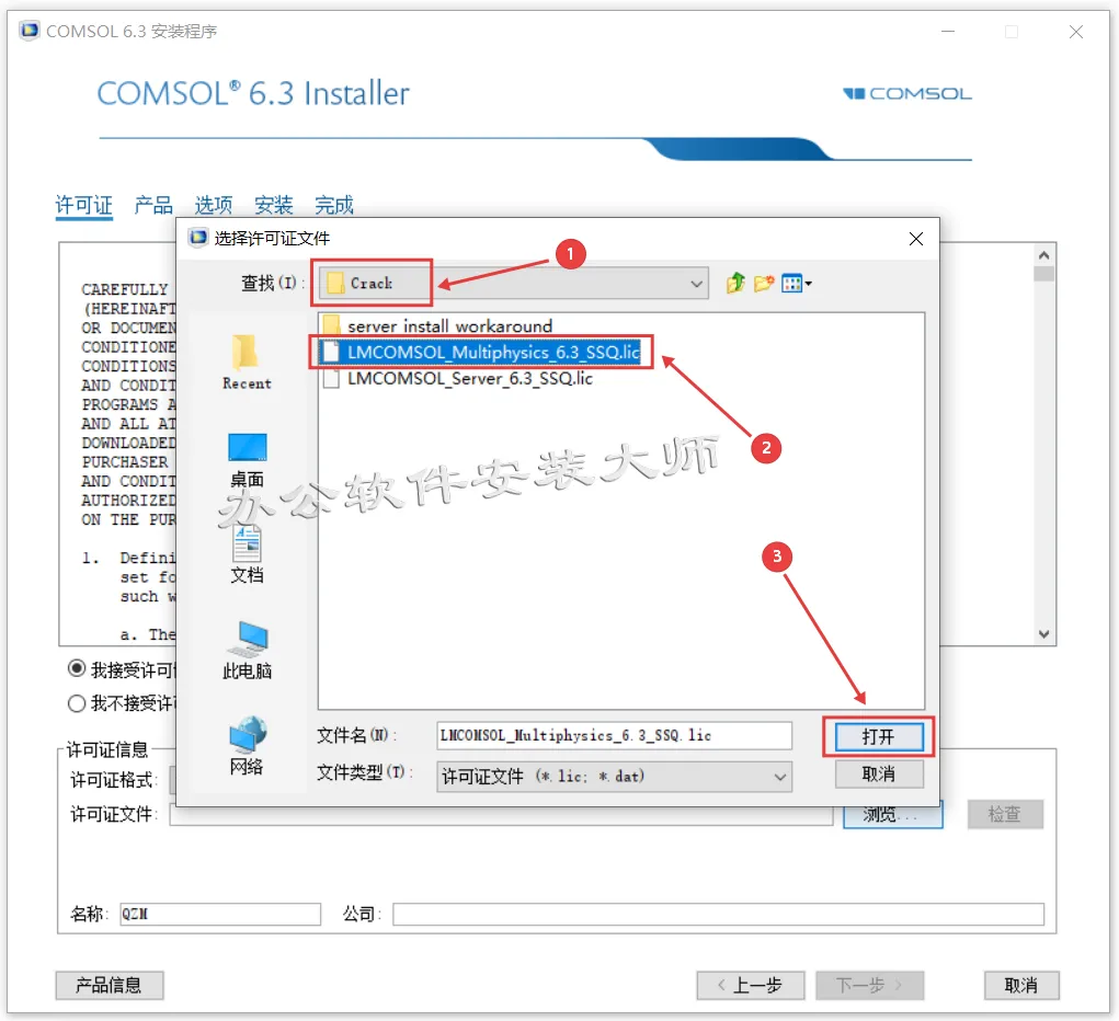 6.打开刚才解压文件里的【Crack】文件夹,选中【LMCOMSOL_Multiphysics_6.3_SSQ.lic】文件,然后点击【打开】。