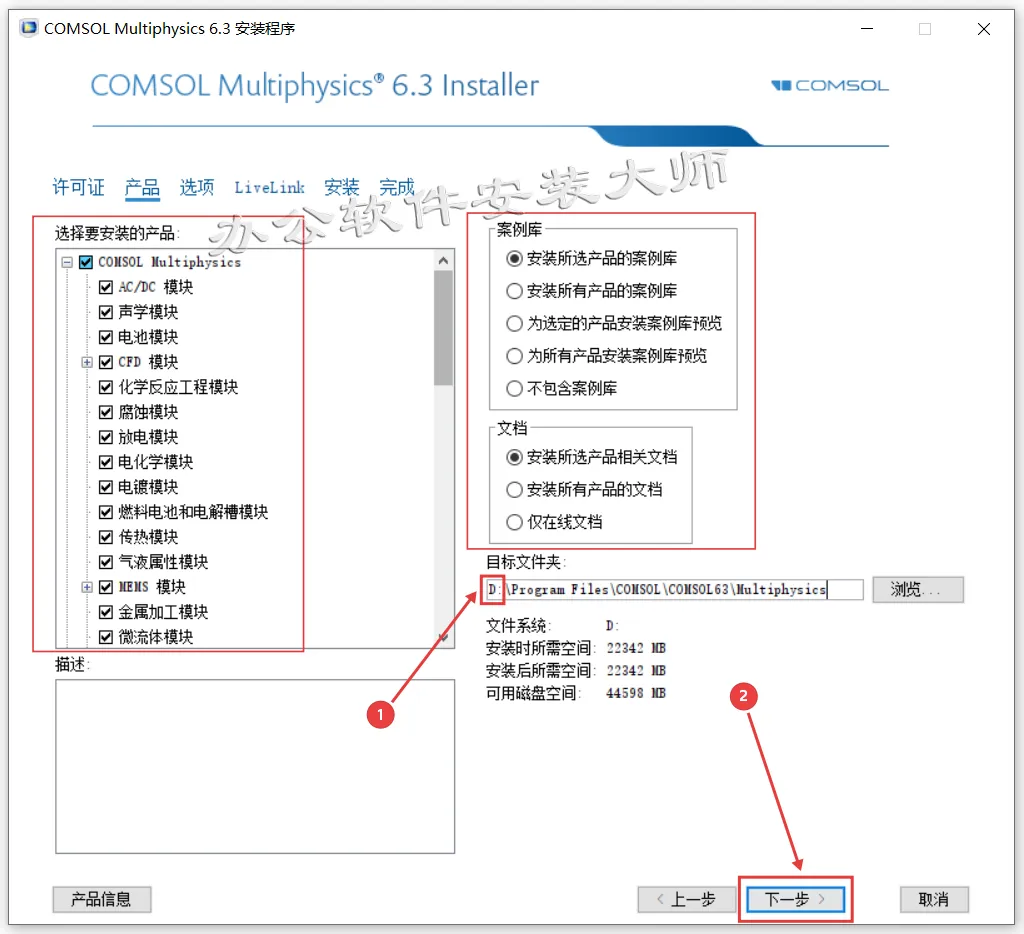 8.勾选需要安装的产品和案例库(默认全选),修改安装路径,可以把地址栏首字母C改成D,软件就会安装到电脑D盘,也可以自行修改安装位置(但注意安装路径不要有中文),选择好后点击【下一步】。