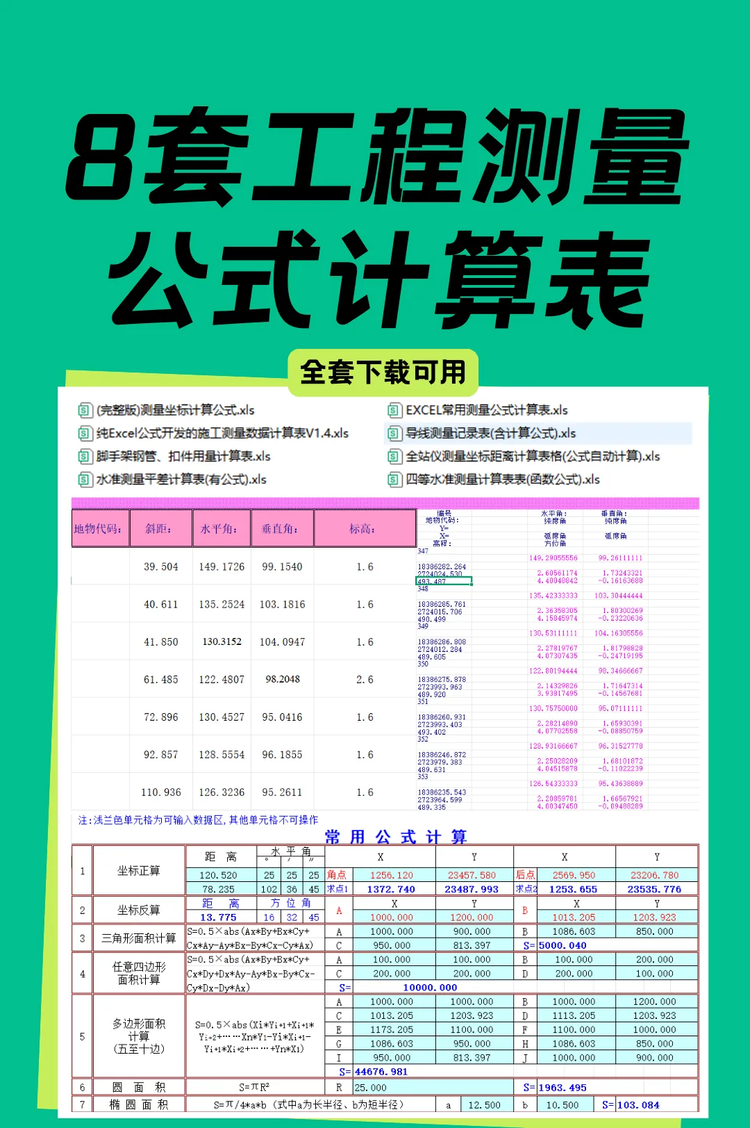 别再瞎摸索!今天这份《最火 8 套工程测量公式计算表》,直接解决核心需求:完整版坐标公式、Excel 自动算的施工表、带公式的导线记录表,还有脚手架用量、全站仪计算表,8 类干货全覆盖!
