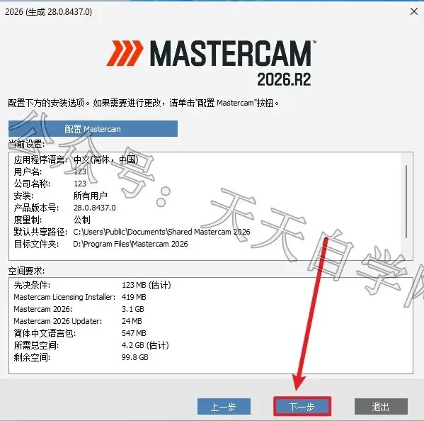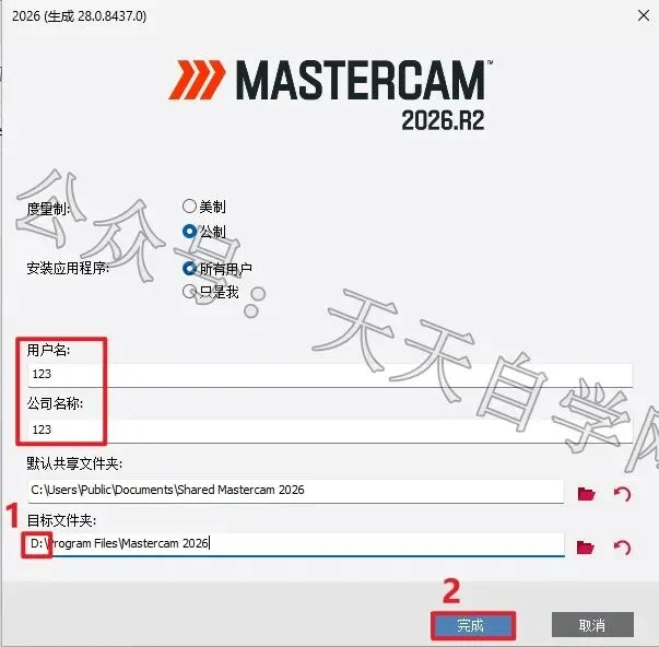 8. 用户名和公司名随意输入,将目标文件夹路径中的C改为D(改为D表示装到D盘),然后点击完成