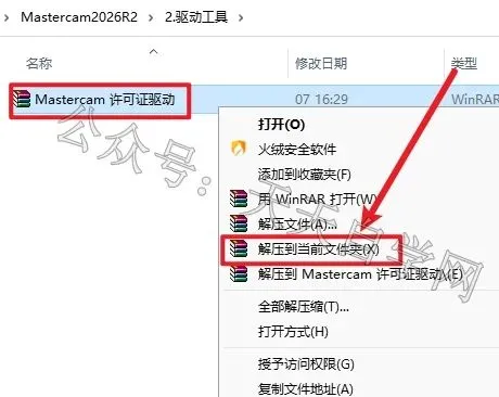 14.选中Mastercam许可证驱动文件,点击鼠标右键选择解压到当前文件夹。