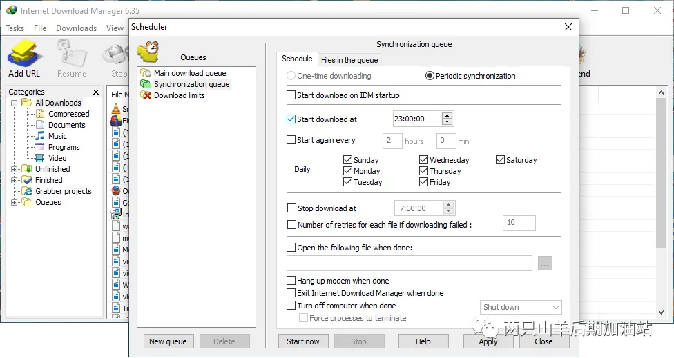 Internet 下载管理器可以在设定的时间连接到 Internet、下载所需的文件、断开连接或在完成后关闭计算机。您还可以使用文件的定期同步来同步更改。可以创建和安排多个下载队列以进行下载或同步。
