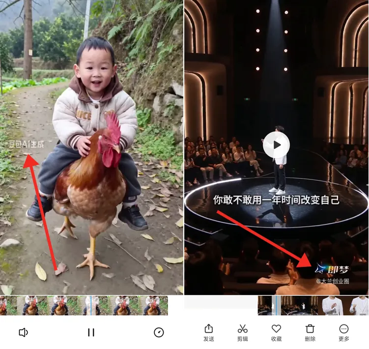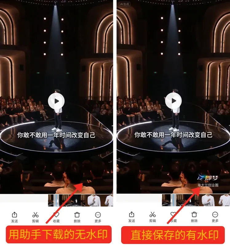 第一步:打开即梦APP的视频,点击下面的分享按钮,选择微信第二步:打找到视频号助手,在对话框长按,粘贴后发给助手,等待几秒后,助手就返回一个下载卡片,打开卡片就可以下载了;第三步:在下载页面,点击下载按钮,等下载完成后,就保存到相册啦。关于去水印有没有效果呢?最后我们来对比一下直接保存的视频和用助手下载的视频是不是效果非常明显呢。大家可以放心下载啦,接下来继续来看豆包的教程吧。🔴豆包AI视频下载:豆包AI视频下载提取器