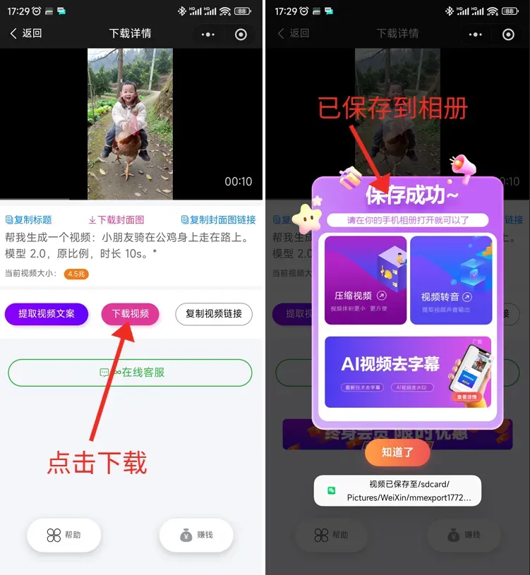 第三步:在下载页面这里,点击下载视频按钮就可以把视频保存到相册啦;