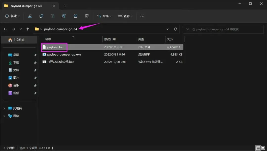 复制 payload.bin 文件到 payload-dumper-go 文件夹里内(如图)