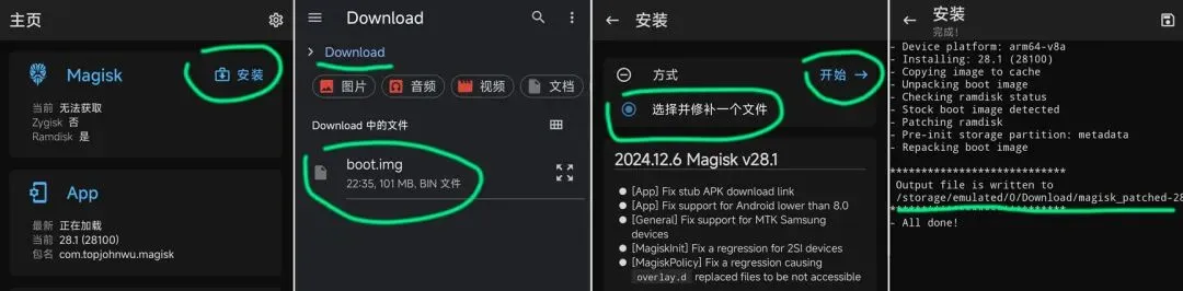手机插电脑,打开 传输文件 模式,复制 init_boot.img 进手机 Download 目录。 手机下载安装 Magisk ,Magisk-download ,如果打不开Github,点这里 提取码:6bhz 安装 – 选择 init_boot.img – 开始修补文件 – 修补完成,修补生成的文件 magisk_patched-xxx.img 在 Download 目录。