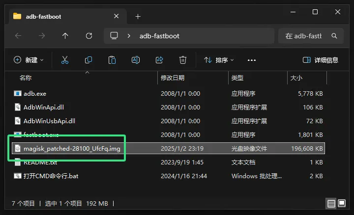 打开 adb-fastboot 文件夹中的 打开CMD命令行 并输入下面命令(将修补的img文件名替换掉下面的“面具文件”):