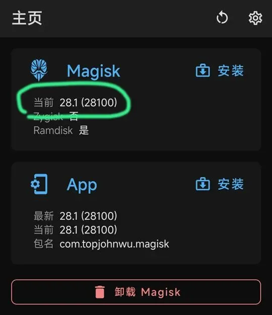 开机有震动基本没问题了,耐心等开机。(显示 Magisk 的版本,就是刷好了的)