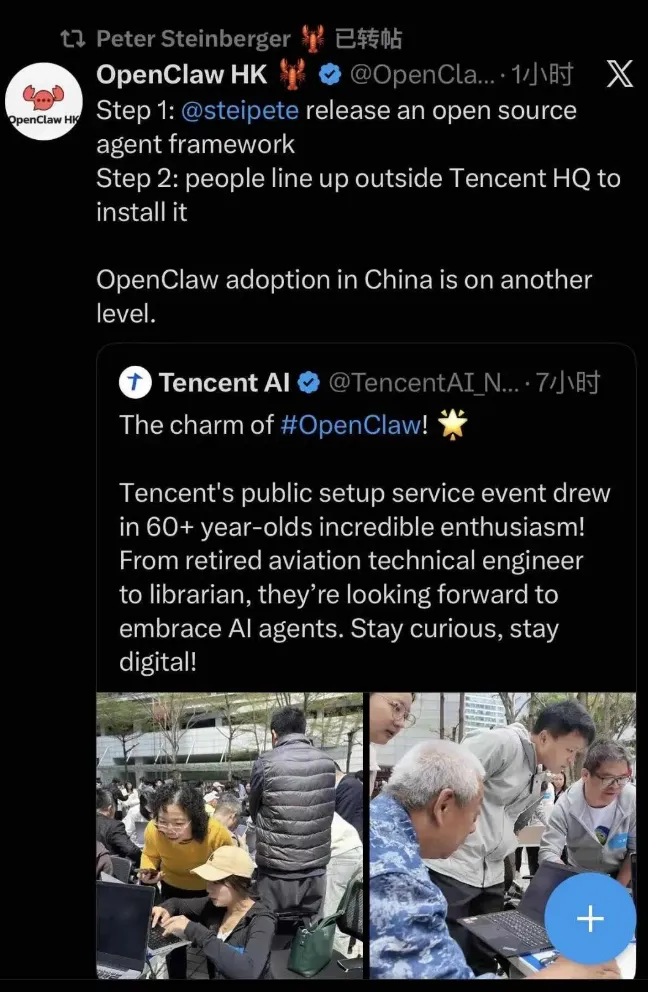 现场部署的年龄从2岁-60岁不等,OpenClaw 创始人 Peter 还转发了鹅厂的活动。