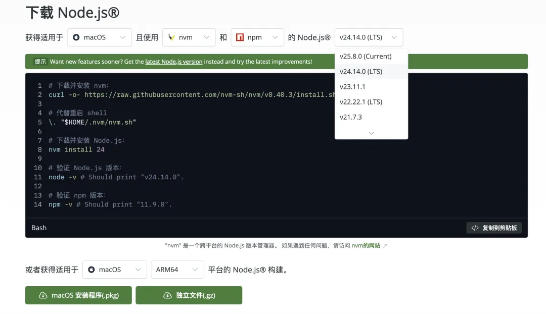 没有安装的,打开官网下载并安装:https://nodejs.org/zh-cn/download 。