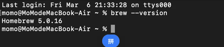 再输入上面的检查命令,验证 Homebrew 安装状态,输出版本号就安装成功了。