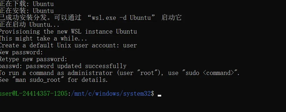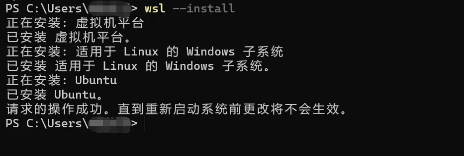 会自动下载和安装 WSL2 和 Ubuntu(一个 Linux 系统),注意⚠️安装好后需要重启电脑。