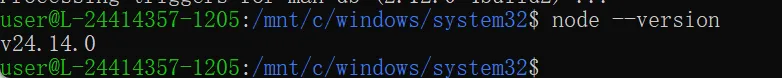 这里是要在WSL里安装Node.js,之前安装的大概率在这里是不生效的。