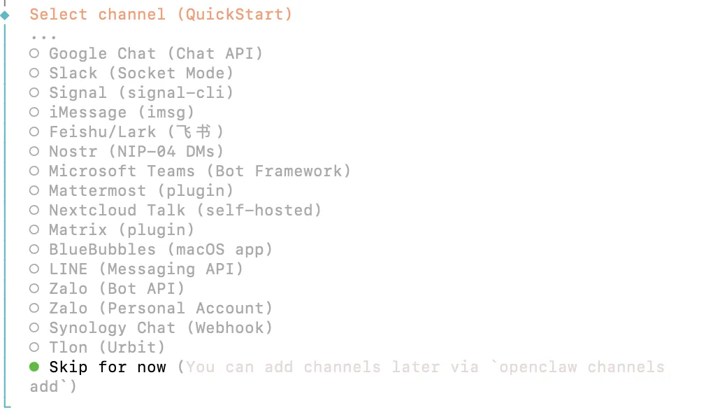 4.配置聊天渠道:现在都推荐飞书,不确定的可以先跳过,安装完可以再通过 openclaw channels add 重新配置。也可以让龙虾帮你接入。