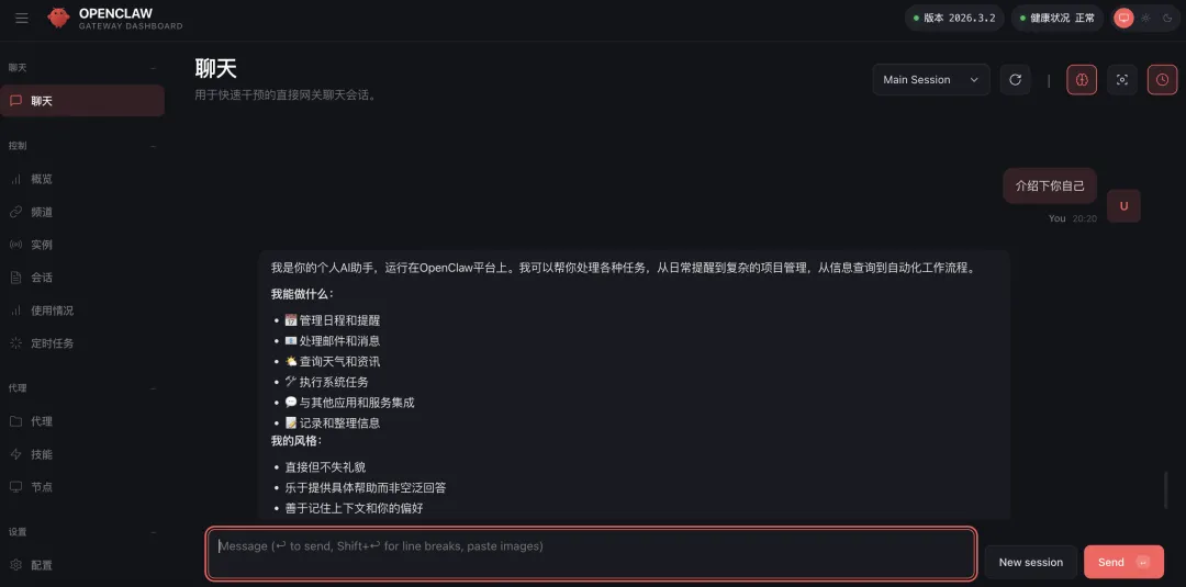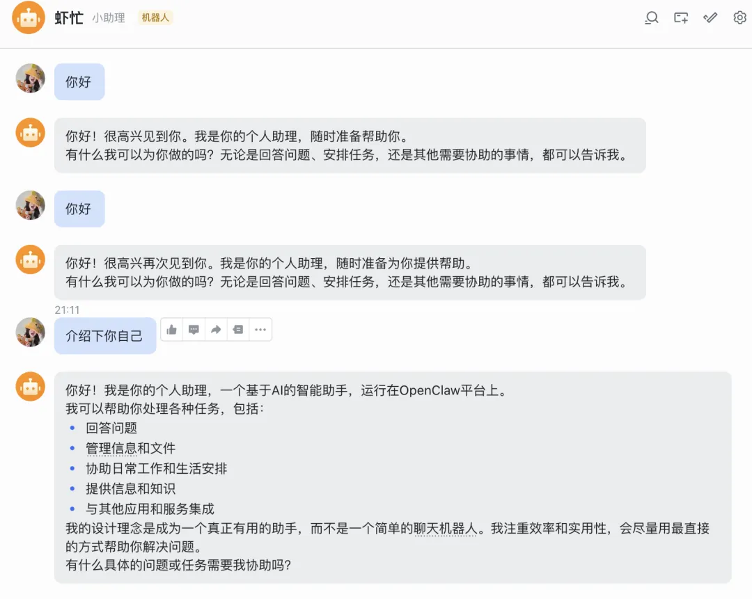 可以发个消息测试一下:“介绍下自己”,有回复就证明ok了。