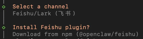 openclaw channels add选择Yes,选择飞书渠道,选择下载安装。