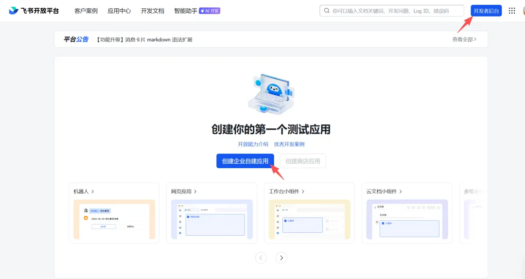 选择开发者后台,点击创建企业自建应用,输入应用名称,选择头像,点击创建。