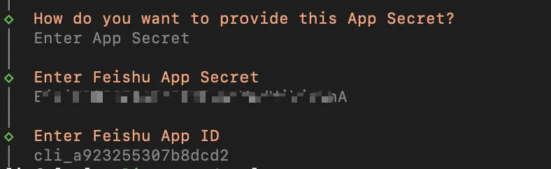 到 Enter App Secret 这一步时暂停,需要先创建飞书机器人。