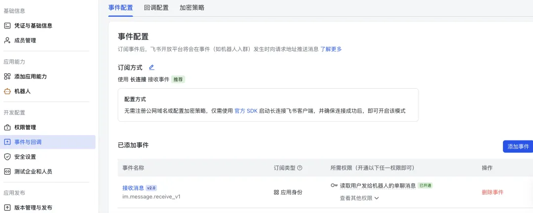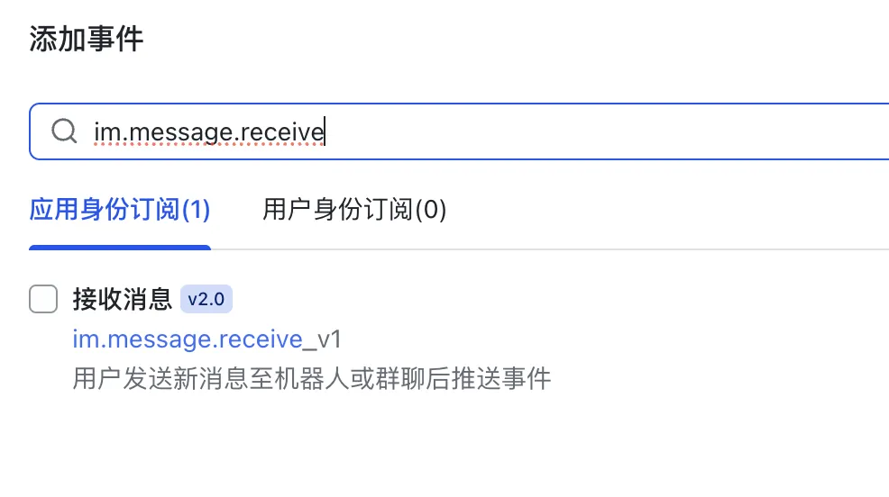 点击添加事件,搜索 im.message.receive_v1 勾选添加。
