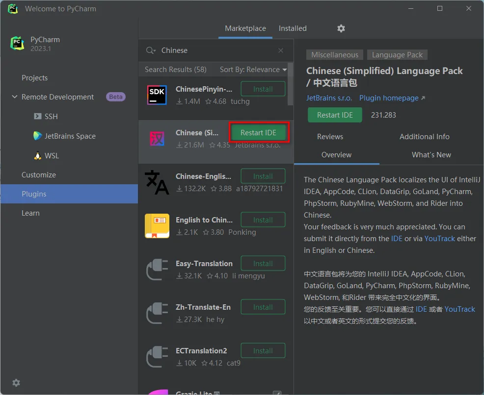 22.点击Plugins,输入:Chinese,找到Chinese(Simplified),点击“Install” ![]() 23.点击“Restart IDE” ![]() 24.点击“Restart” ![]() 25.安装结束 ![]() |