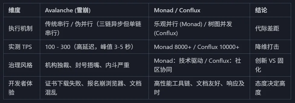 说到技术实力,我结合公开数据,用一张表就能说清 Avalanche 与 Monad、Conflux 的差距,所谓的「速度优势」,不过是自欺欺人: