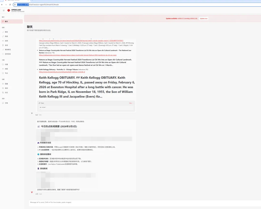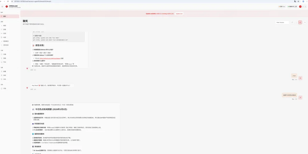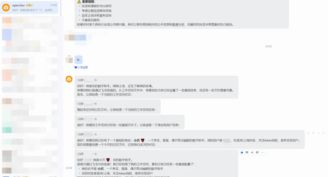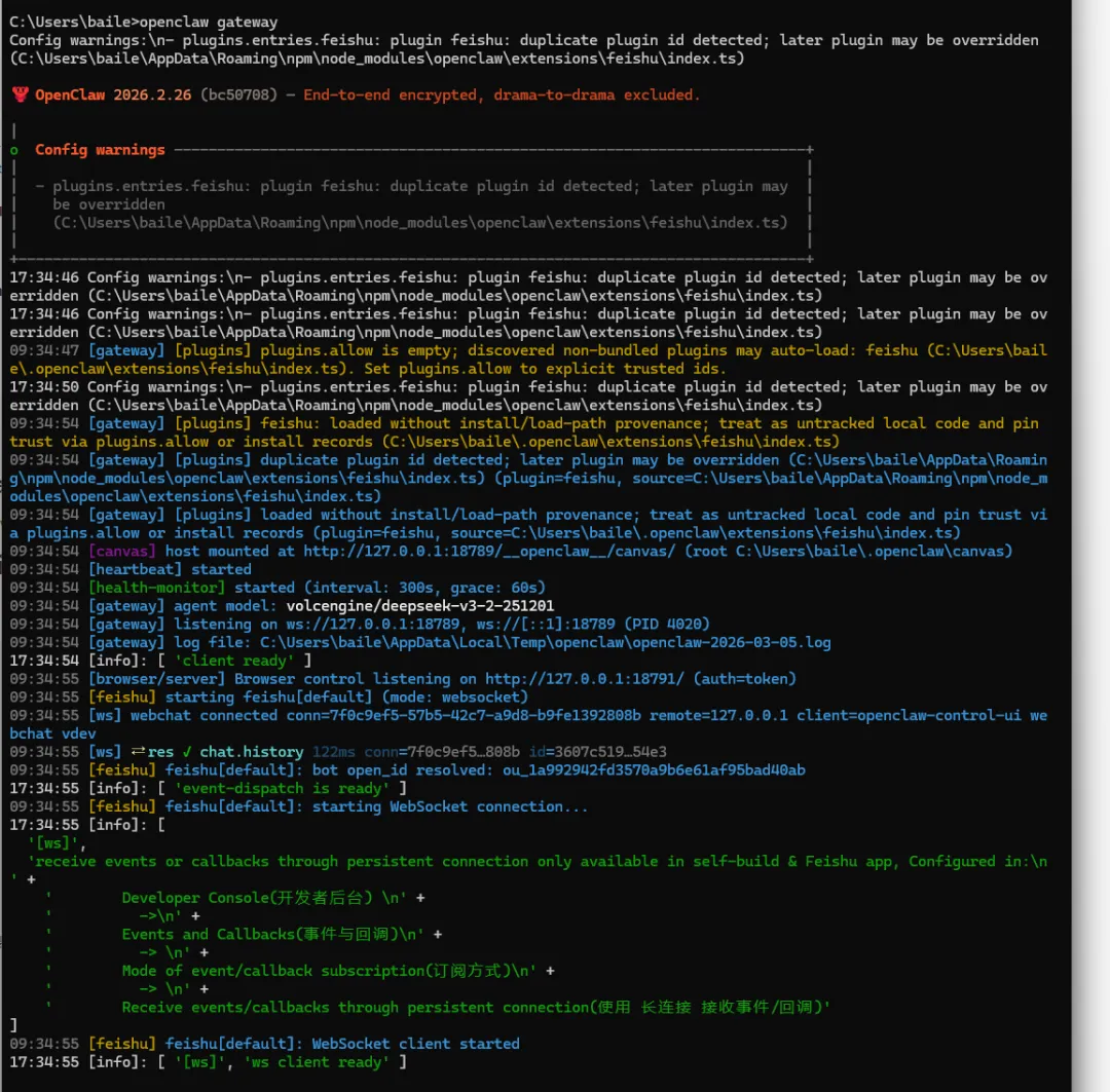 安装成功后,系统会接入飞书机器人。在命令行启动时,你会看到飞书相关的连接提示。之后有任何需求,直接在飞书里发消息,控制OpenClaw来为你工作。