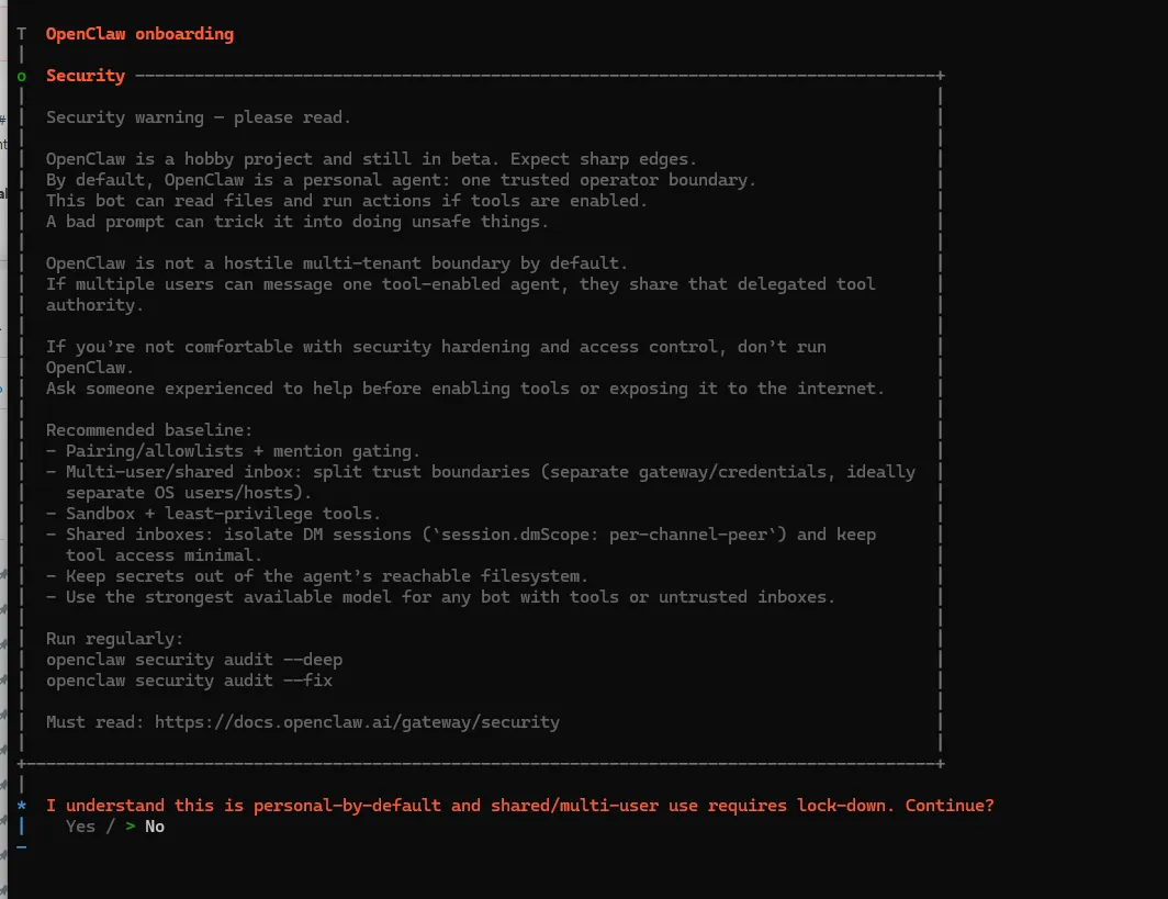 npm install -g openclaw@latestopenclaw onboard --install-daemon这里会有一个选择,大概意思是OpenClaw 处于测试阶段,默认仅个人使用,可操作系统文件,开启工具后有安全风险。这里如果担心可以使用虚拟机的方式。虚拟机安装看这里vmware官网免费下载安装教程