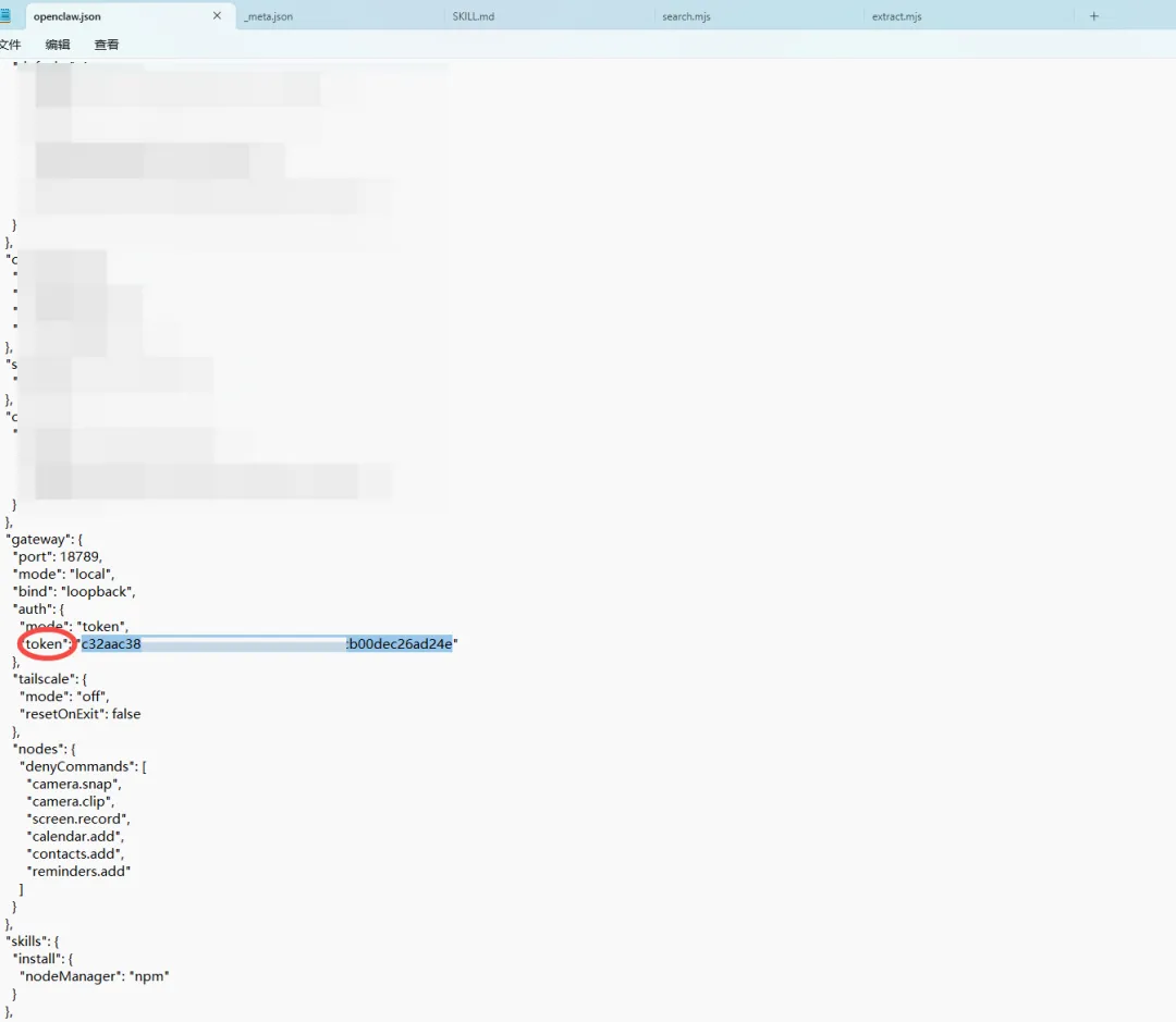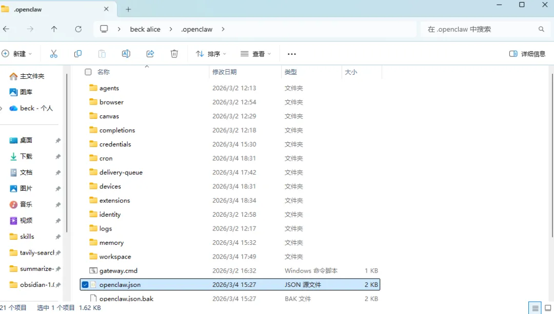 这里有个openclaw.json,里面存储着你得一些配置,token在这里存储
