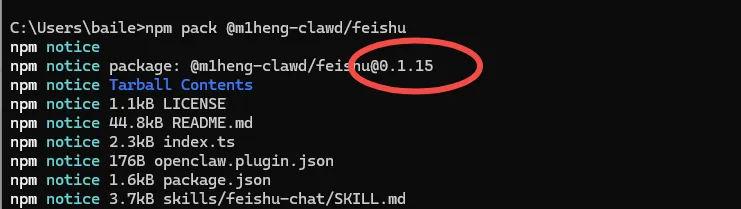 下面的version记得更换上面输出的版本,例如openclaw plugins install ./m1heng-clawd-feishu-0.1.15.tgz