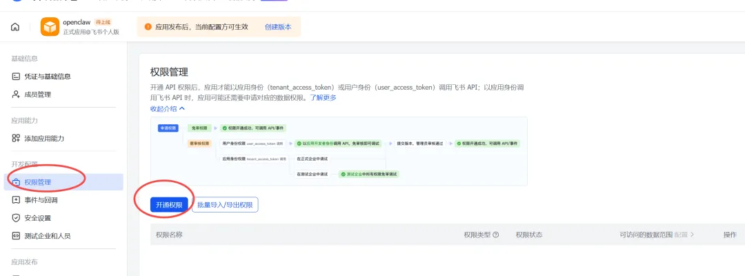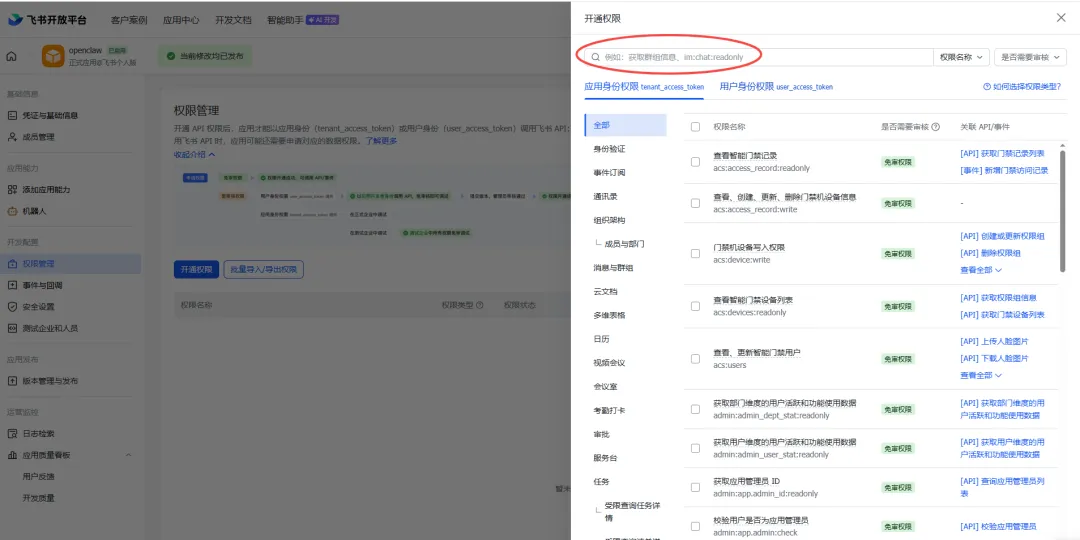 openclaw config set channels.feishu.appId "cli_xxxxx"openclaw config set channels.feishu.appSecret "your_app_secret"openclaw config set channels.feishu.enabled true3、开通权限