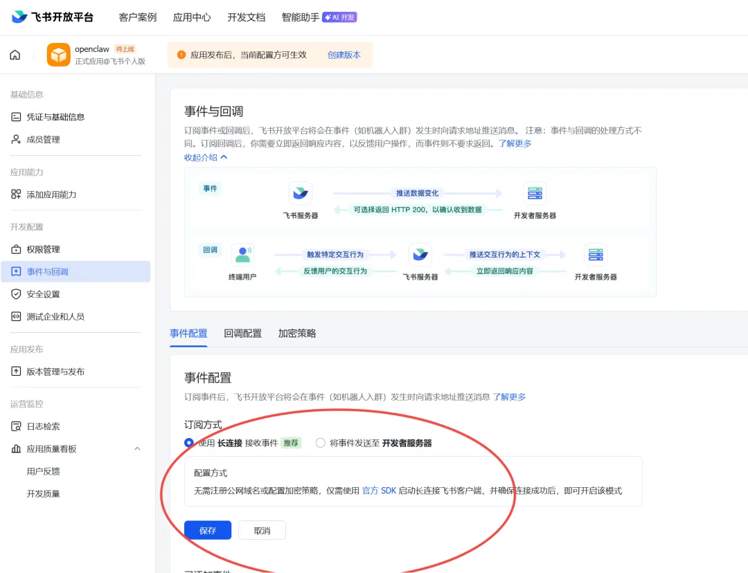 4、配置事件订阅这里配置事件订阅需重新启动openclaw,启动后,然后再点击下面保存按钮。
