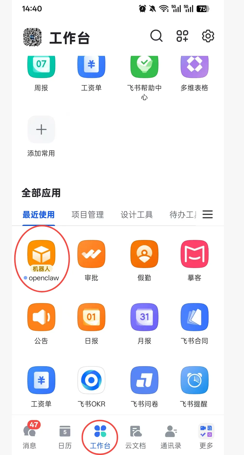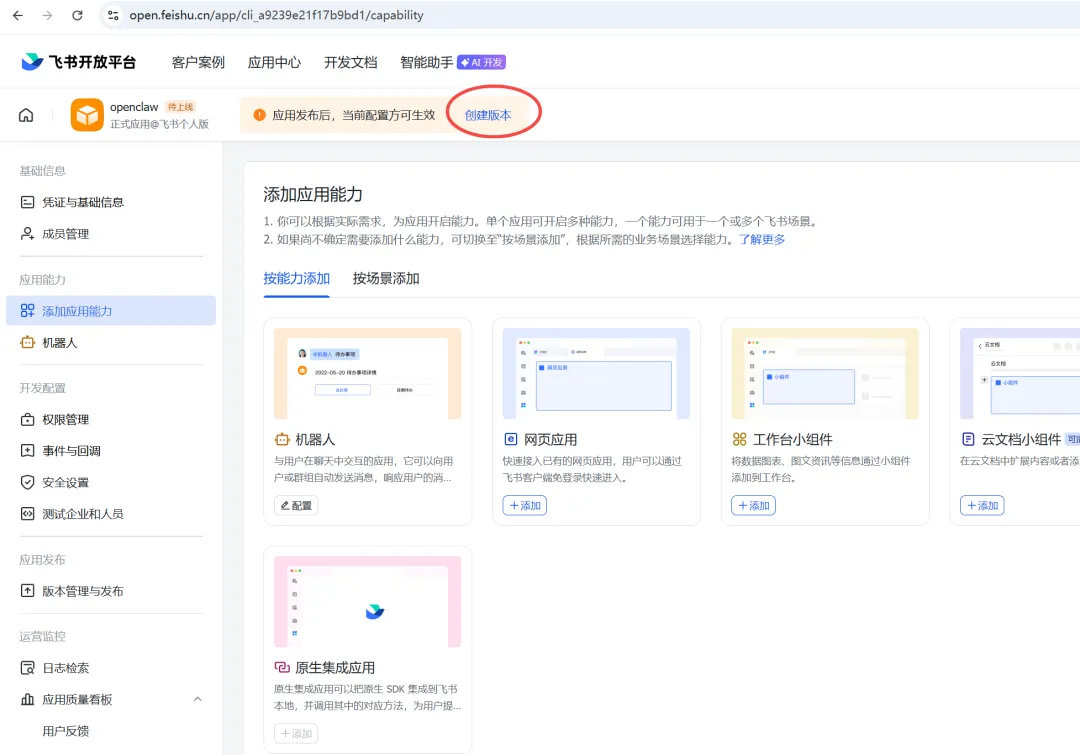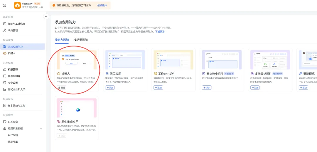 5、发布应用,首先添加应用能力,可以选择机器人,在飞书的工作台可以找到你创建的机器人