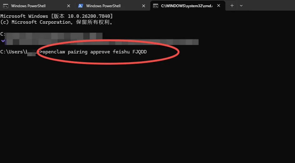 OpenClaw: access not configured.Your Feishu user id: ou_fb2bb2d0bc3bddd76a07c4Pairing code: FJQDDAsk the bot owner to approve with:openclaw pairing approve feishu FJQDD在命令行窗口运行,注意这里FJQDD要换成你的