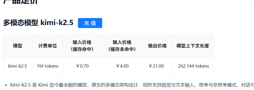 生成密钥后,立即复制保存,谨防泄露,后续可在该页面管理密钥权限、查看调用额度。这里一定要注意价格,kimi-k2.5百万token,输入4块钱,输出21块钱,当然也有优点响应速度快