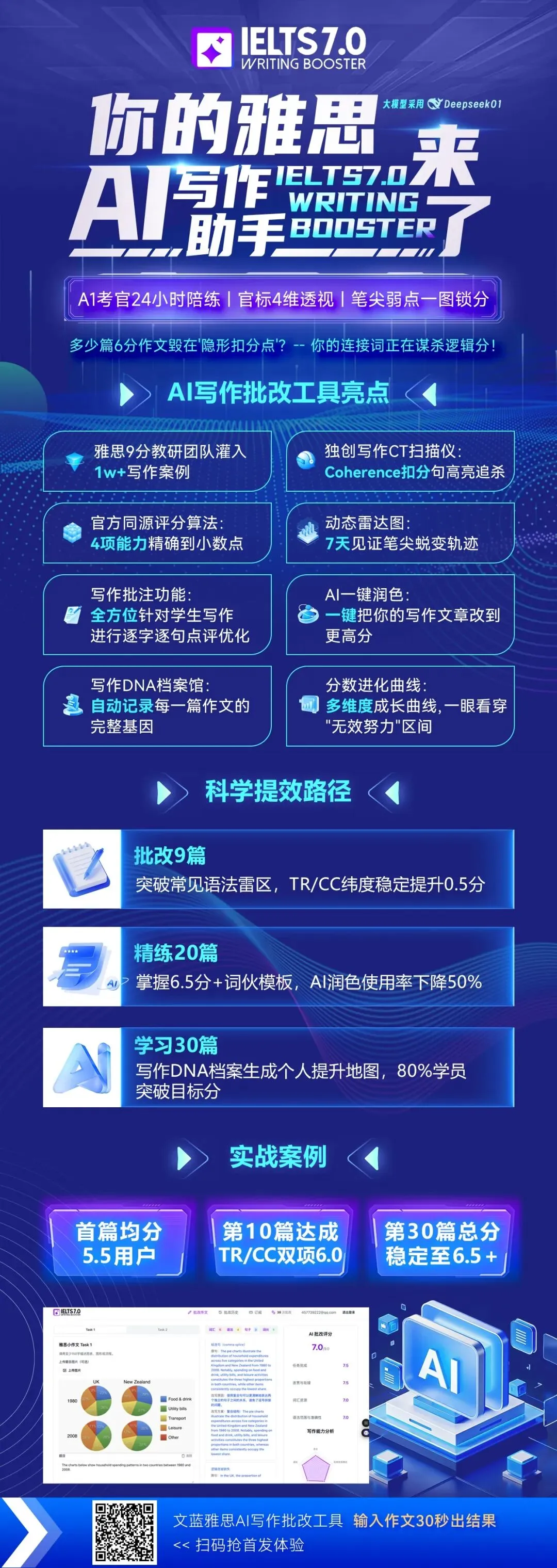 这不是普通的批改工具,它是基于超一万篇真实雅思作文+考官评分数据训练出来的,融合了剑桥雅思评分标准和DeepSeek AI模型的算法能力,几乎是把雅思考官请回了家!