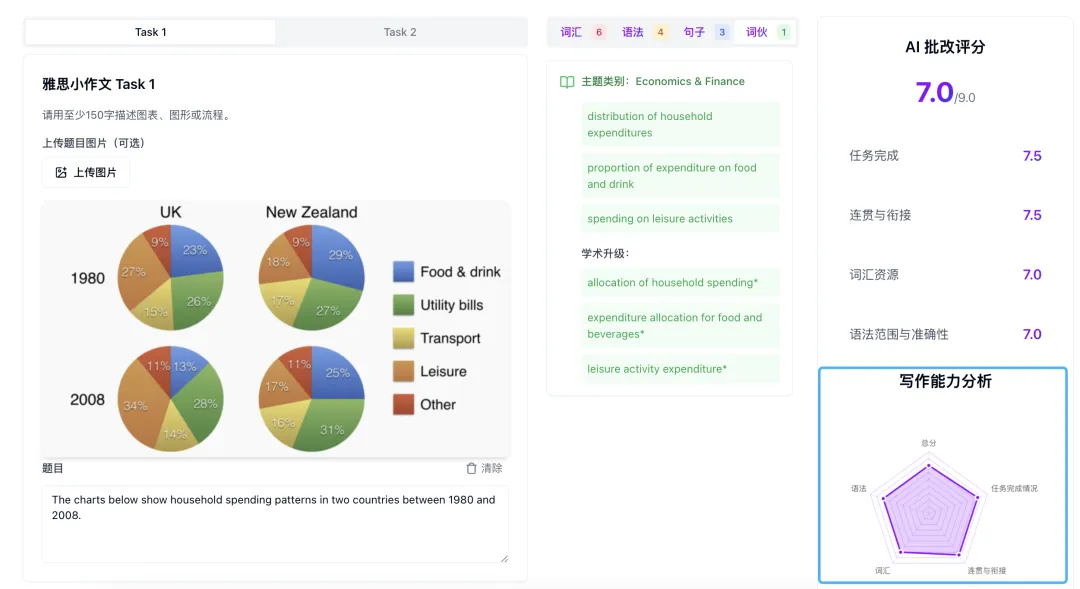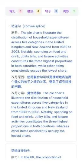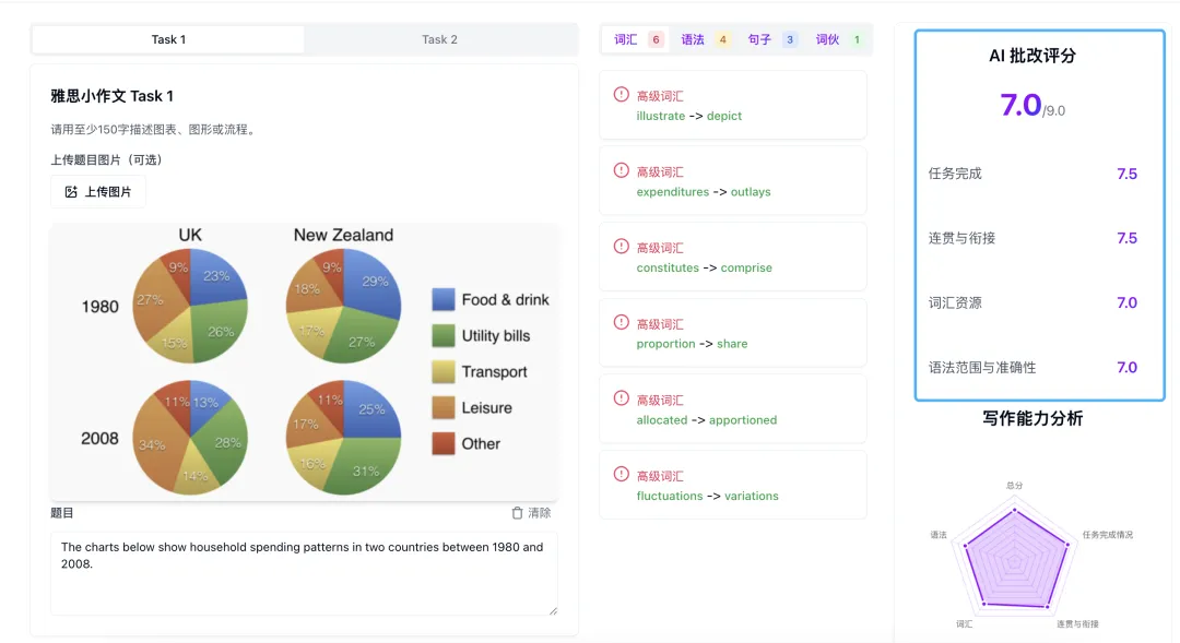 就像一位经验丰富的雅思考官,手把手帮你拆解写作问题、指出方向!