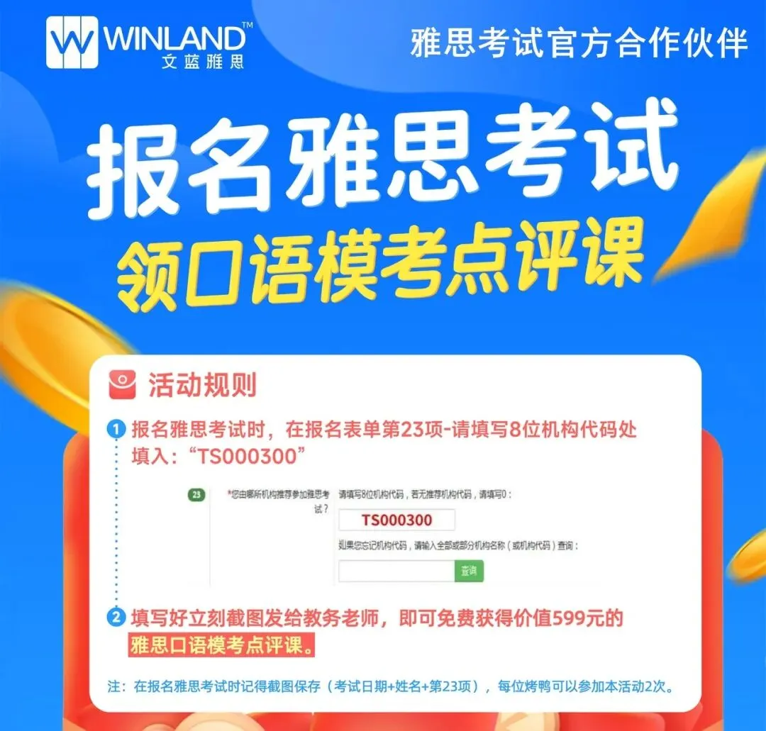 报名雅思考试时,在报名表第23项填写机构代码「TS000300」,截图发给小助手,即🉑免费领取30分钟雅思口语模考!
