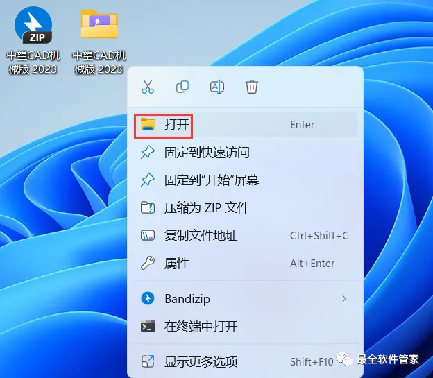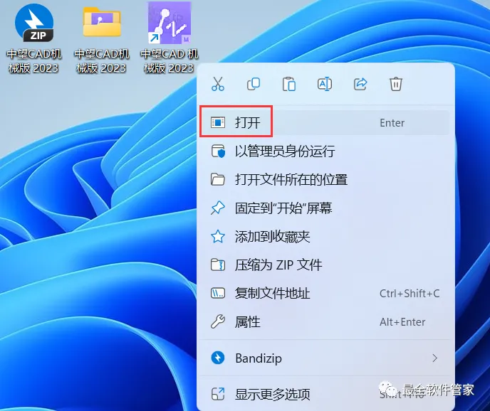 21、回到桌面,右键桌面上的【中望CAD机械版 2023软件图标】,点击【打开】