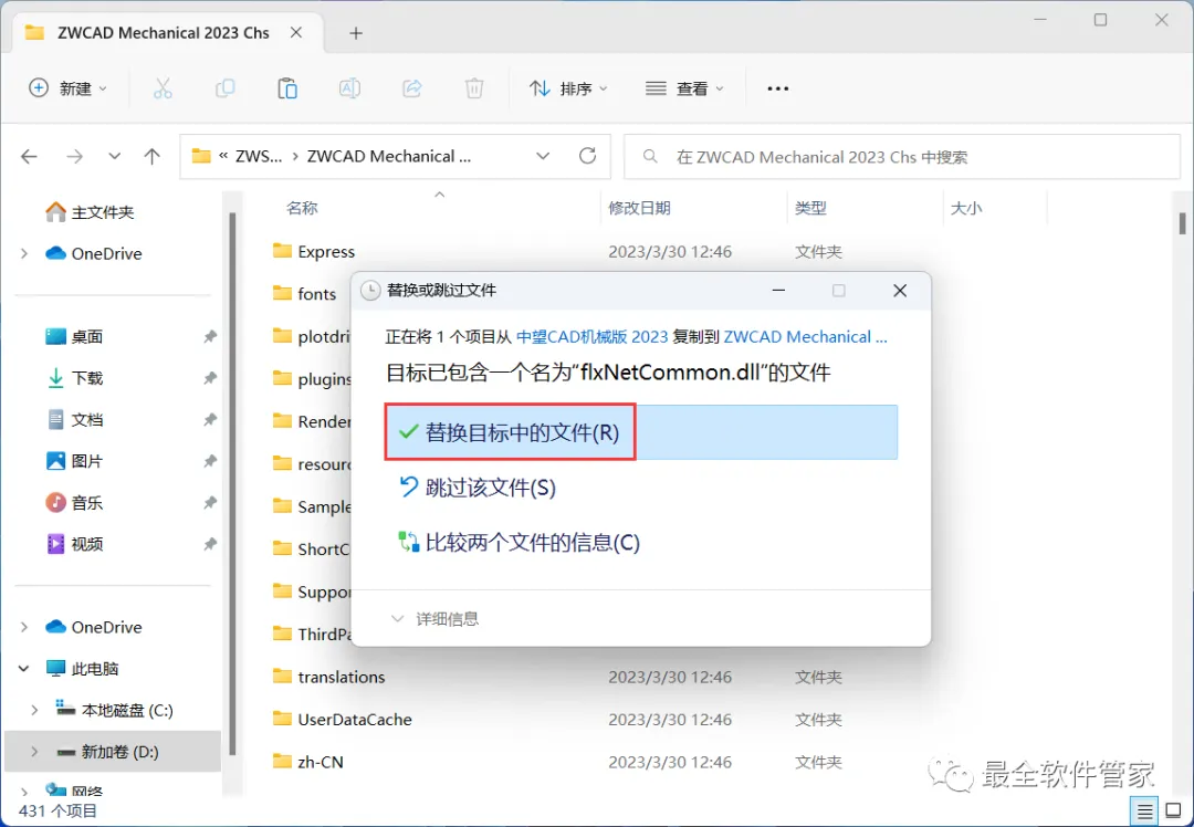 8、回到中望CAD机械版 2023文件夹,找到【flxNetCommon.dll】文件,右键点击【复制按钮】
