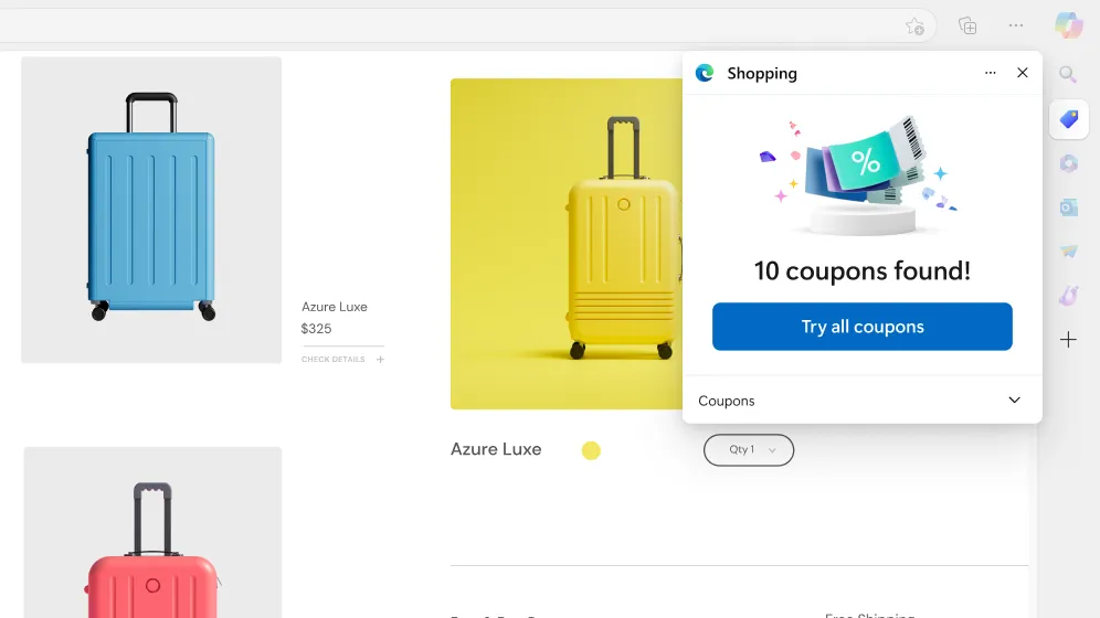 使用 Microsoft Edge 随时随地购物,省钱。当您将商品添加到购物车时,Edge 会主动扫描互联网以查找可用优惠券和折扣代码,以便在您结账时应用。