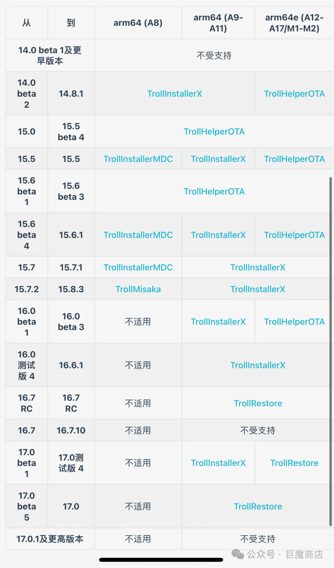 下面是TrollnstallerX 支持范围图,小伙伴们可以对照下自己手机的型号以及版本看下是否可以安装。接下来就开始给大家展示如何操作安装。